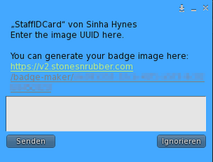 Grab a copy of the Staff ID card from the Staff Vendor. Wear it and after a moment it will present you a blue SL menu with some text and an input area. Ignore the area for now and just click on the link above it. This will redirect you in your browser to the Badge Maker website.